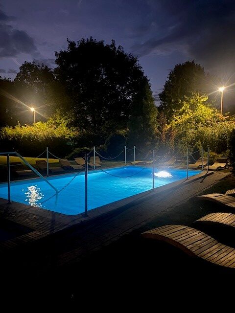 V areáli strediska je aj vonkajší bazén s ležadlami.